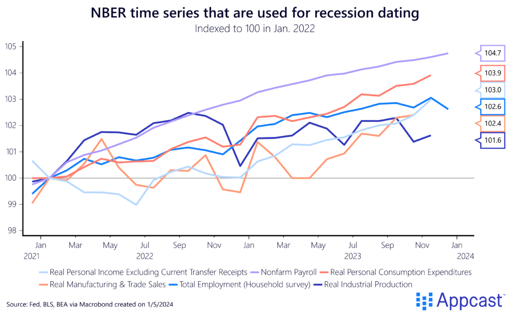 Beyond just the labor market, look at other economic indicators throughout 2023. In early 2023, talk of an imminent recession dominated the economic discourse. I wrote in March 2023 how I did not think a recession was coming. My proof? Just look at the six indicators tracked by the Business Cycle Dating Committe at the National Bureau of Economic Research (NBER), which dates the start and end of recessions in the U.S. These indicators include some measures of the labor market’s health, but also personal income and spending, manufacturing, etc. Across-the-board, there was no sign in 2023 of broad-based weakness in the economy. Clearly the U.S. has avoided a recession (so far).