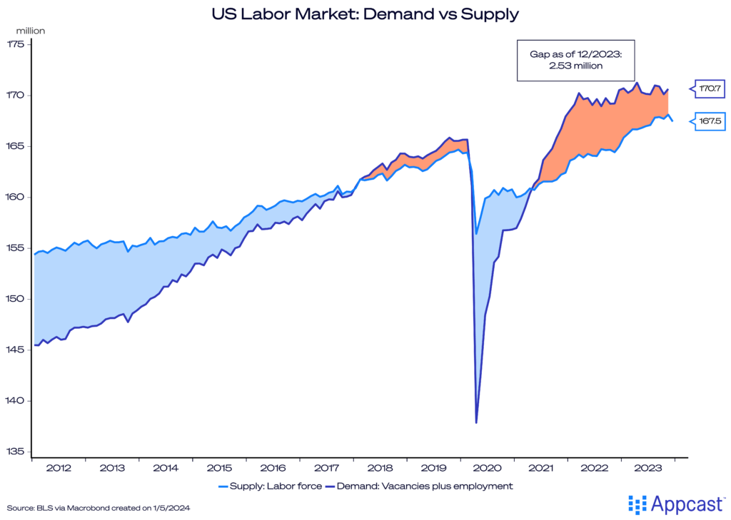 Let’s go back to Economics 101: Supply and Demand. Labor demand continues to exceed supply by about 2.5 million in December. But this gap is narrowing. Despite the growth in labor force participation over the year, the labor market remains unbalanced, with fewer people looking for jobs than there are jobs available. As the population continues to age, this trend is likely to continue, barring an increase in productivity. Expect the orange area here to shrink as 2024 progresses.