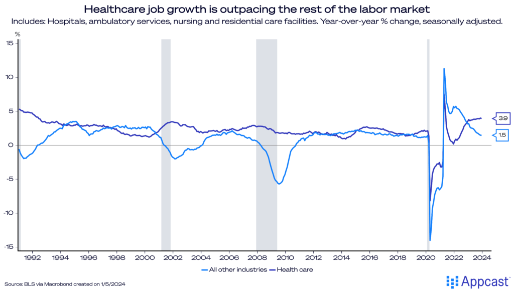 It’s particularly noteworthy how healthcare job growth has accelerated even as non-healthcare job growth has weakened. Year-over-year, healthcare jobs grew by nearly 4%, while the rest of the job market rose by just 1.5%.