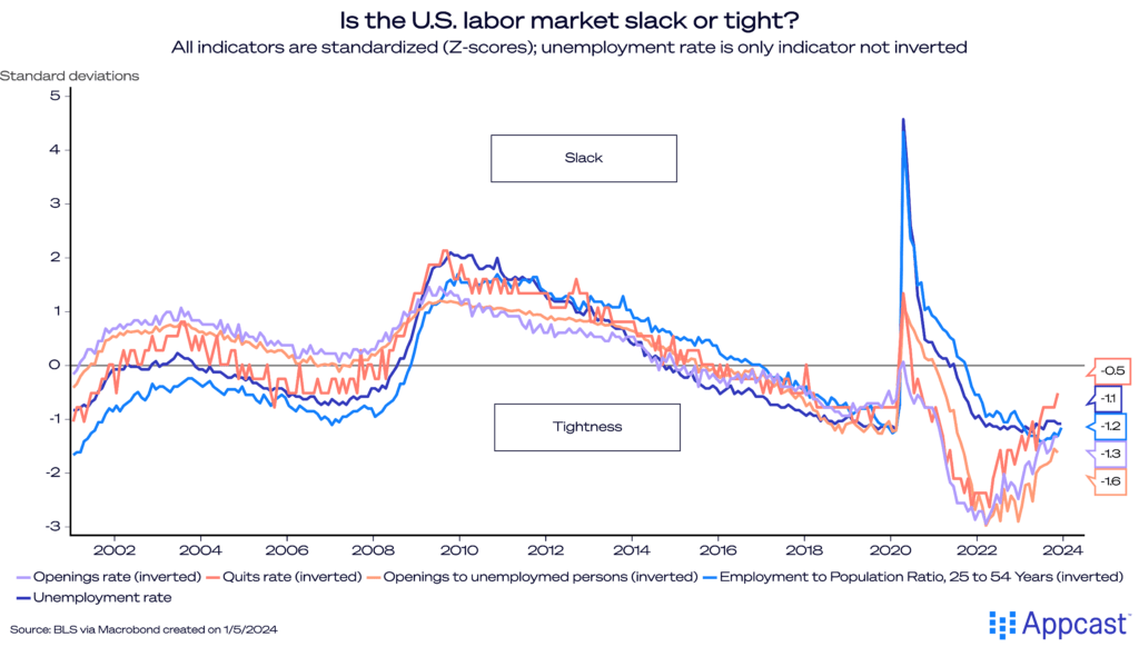 The second chart was a bit more complicated. Inspired by the work of Jason Furman and Wilson Powell III, the graph below plots five indicators of labor market tightness – from the unemployment rate to the prime-age employment-to-population ratio. These indicators are standardized (using Z-scores) to allow for an apples-to-apples comparison. Four of the five indicators normalized throughout the year, moving closer to a “slack” labor market, while still remaining “tight” (just less so than a year ago). Taken together, these two charts confirm that the U.S. labor market softened in 2023 without a rise in layoffs. Impressive and very much consistent with a “soft landing.”