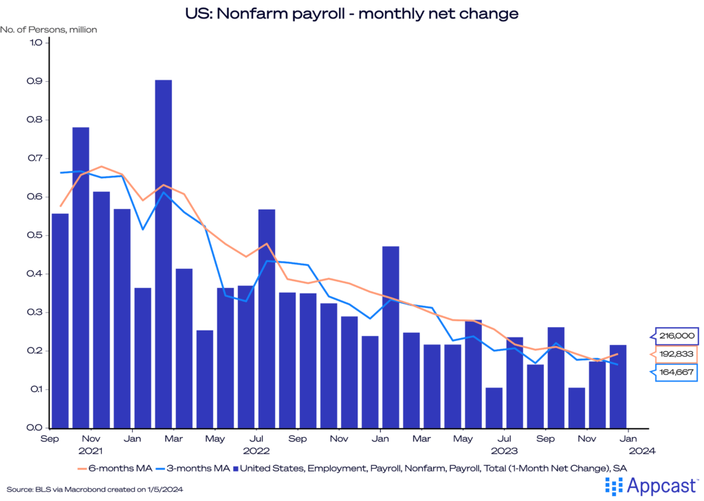 Expect hiring to slow, but with no dramatic reversal toward job losses. Nonfarm payroll gains slowed throughout the year, but in December 2023 the U.S. labor market added 216,000 net new jobs and the unemployment rate remained unchanged at 3.7%. This is strong momentum as we move into a new year. The definition of spike has shifted in the past two years, though: In 2022, that meant several hundred thousand more jobs were added than the month before. Now, as we move into beige territory, that just means a couple tens of thousands more.