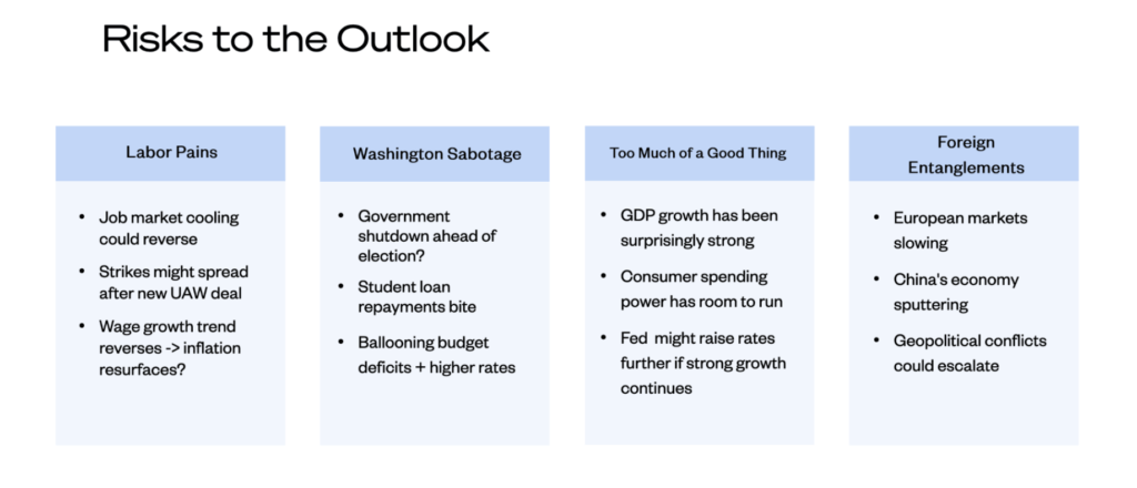 However, there are risks to the outlook. Below we detail four of them. Barring a severe government shutdown or geopolitical escalation, the greatest risk is the economy re-heats – the “Too Much of a Good Thing” scenario. Above-trend GDP growth, should it continue alongside surprisingly robust job gains, could tip the Fed’s hand into forestalling rate cuts (or perhaps even resuming hikes).