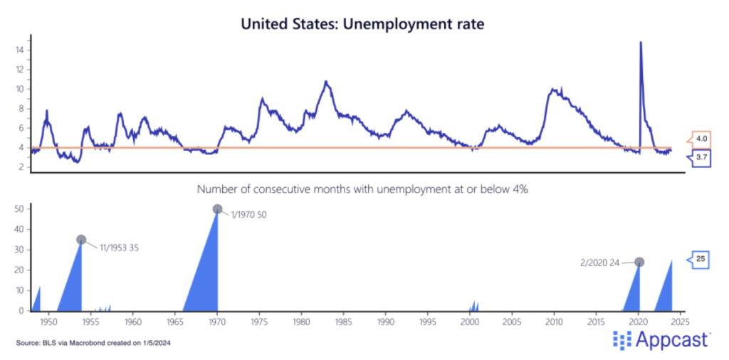The unemployment rate remained steady at 3.7% in December, adding to a long streak of 4%-or-below unemployment. This is now a 54-year record!