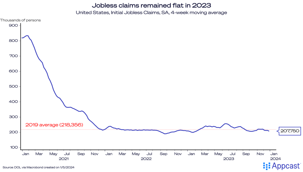 Before we dive into the latest jobs report, let’s take a moment to reflect on last year. About a year ago, I mentioned two charts on the U.S. labor market that I was going to keep a close eye on in 2023. The first was to monitor layoffs: initial jobless claims. Throughout the year, claims remained subdued at a low level. There was no broad spike in unemployment, despite the headlines of tech-related layoffs.
