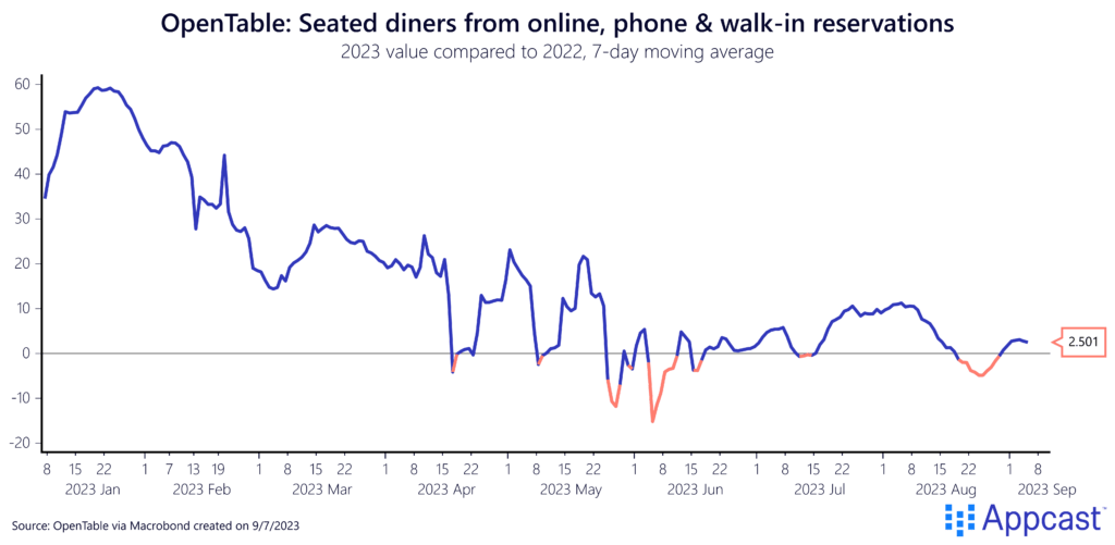 OpenTable has data on the restaurant industry for several advanced economies. Their graph below shows the number of seated diners from online, phone, and walk-in reservations for current OpenTable restaurants in Germany. It measures the weekly change in seated diners in 2023 compared to 2022. A negative value thus indicated fewer restaurant visitors compared to last year.