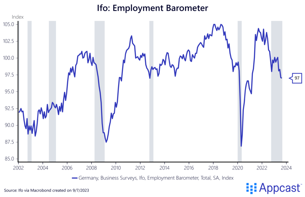 The German economy entered a technical recession in Q4 of last year. While growth in the second quarter of 2023 was exactly zero, a large number of high-frequency indicators are currently signaling another economic downturn in the months ahead. While the labor market will likely weaken as a result, we think that the structural problems of missing workers will outweigh the cyclical factors. Weak demand will first translate into a significant decline in vacancies before affecting employment. Unemployment will most likely remain low as companies will hoard labor.