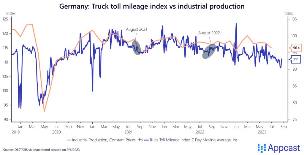 The truck toll mileage series recently plunged and is now more than six percent lower than in August 2022 and August 2021. We should therefore expect continued weakness and even a further decline in German industrial output in the months ahead.
