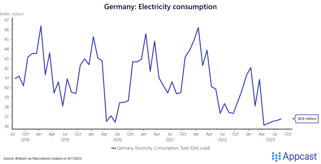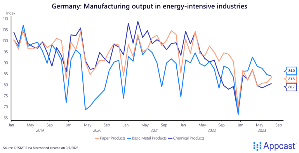 The current decline in energy consumption is a result of some of Germany’s most energy-intensive sectors producing much less output than just a year ago. Manufacturing output of paper products, basic metals, and chemical products have plummeted since early 2022 as Germany’s energy prices soared more than in other European countries.