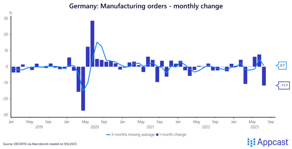 German manufacturing orders slumped by more than 11% last month, a much steeper decline than expected by most economists, according to Bloomberg. This is yet another sign of how much the German economy is dependent on external (foreign) demand, which is now turning out to be a major weakness.