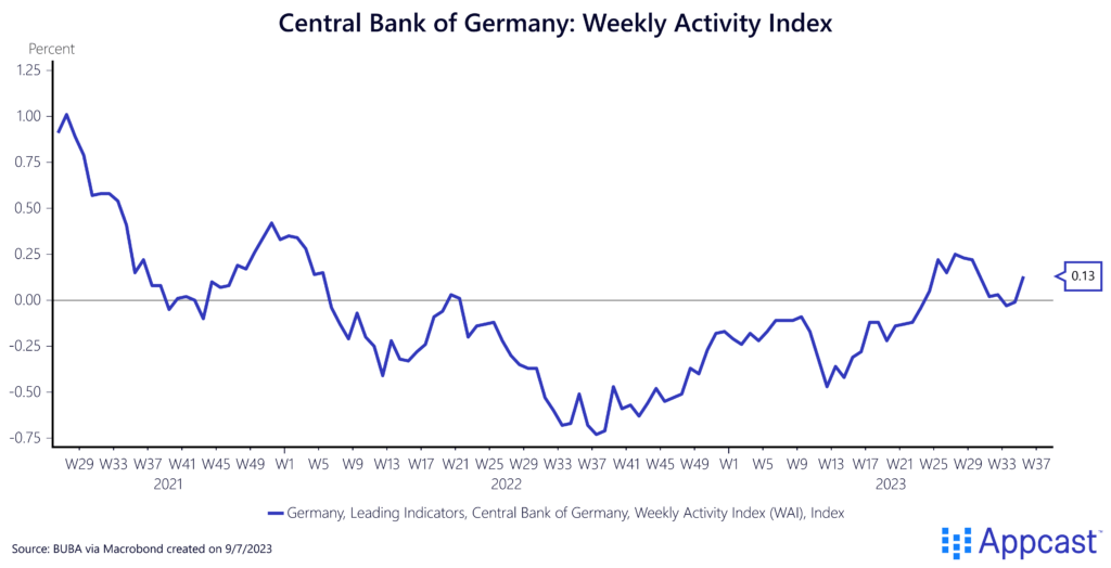 The German Central Bank is publishing a weekly activity index (WAI) that is based on nine different high frequency indicators, including truck toll mileage and electricity consumption mentioned above. The current positive value of about 0.13 indicates above-average growth for the last 13 weeks compared to the previous 13 weeks. However, keep in mind that growth in the second quarter was zero and that Germany’s trend growth is very low. The current value for the WAI is thus hardly mind-blowing and rather indicates continued stagnation than anything else.