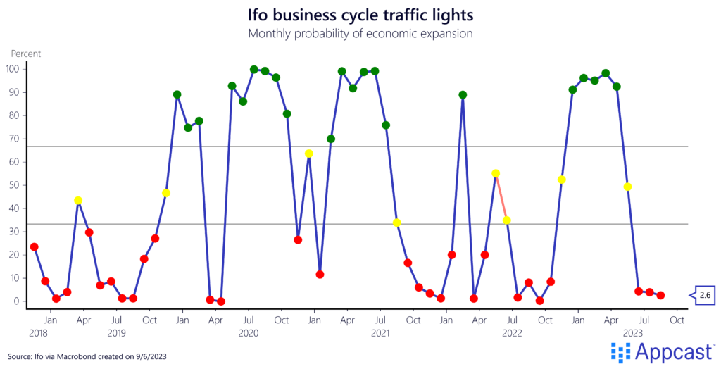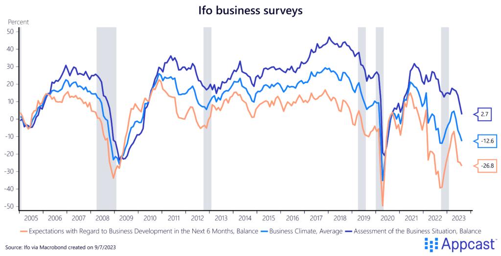 Economic surveys are currently foreshadowing that the German economy will shrink again in the second half of the year. The Ifo indicators – Germany’s most renowned business survey – have declined for the third month in a row. Current values show that the business climate is severely depressed and consistent with an economic contraction.