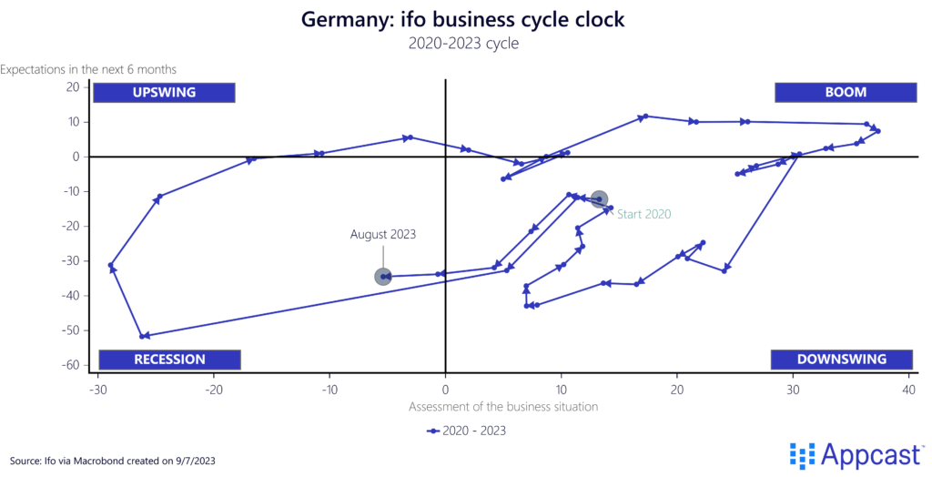 This is also confirmed by the famous Ifo business cycle clock, which plots the current assessment of the business situation vs. near-term expectations. The four quadrants show in which economic phase the economy is right now. And as of July 2023, Germany’s economy entered recession territory again.