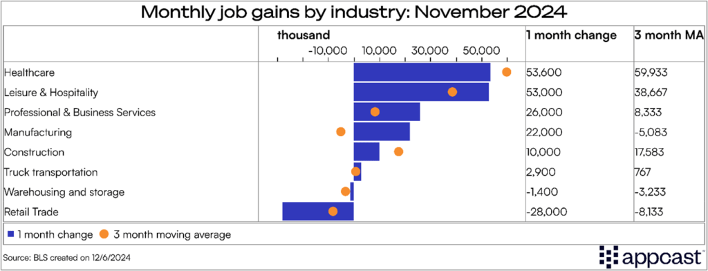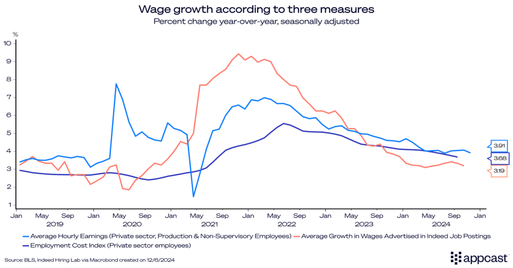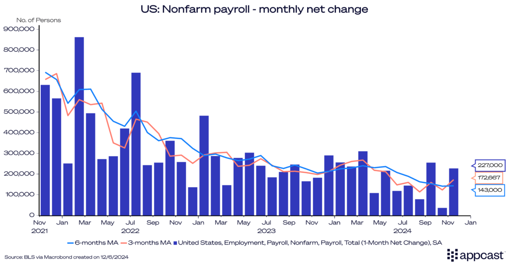 This month’s strong job gain was to some extent a result of last month’s weakness. Generally speaking, employment growth is continuing on a downward trend. This is rather unsurprising as the job boom coming out of the pandemic is basically over. Long-run demographics suggest that trend growth for the U.S. labor market might be closer to 100,000, which is where we are heading now. With wage growth being down to 4% while unemployment remains historically low, the Fed has pretty much achieved its soft-landing. The hiring outlook, of course, remains somewhat cloudy as vacancies also continue to decline. Additionally, we still don’t know what policies the Trump administration will actually implement and how they will affect the labor market. Stay tuned for a 2025 that will probably be less boring!