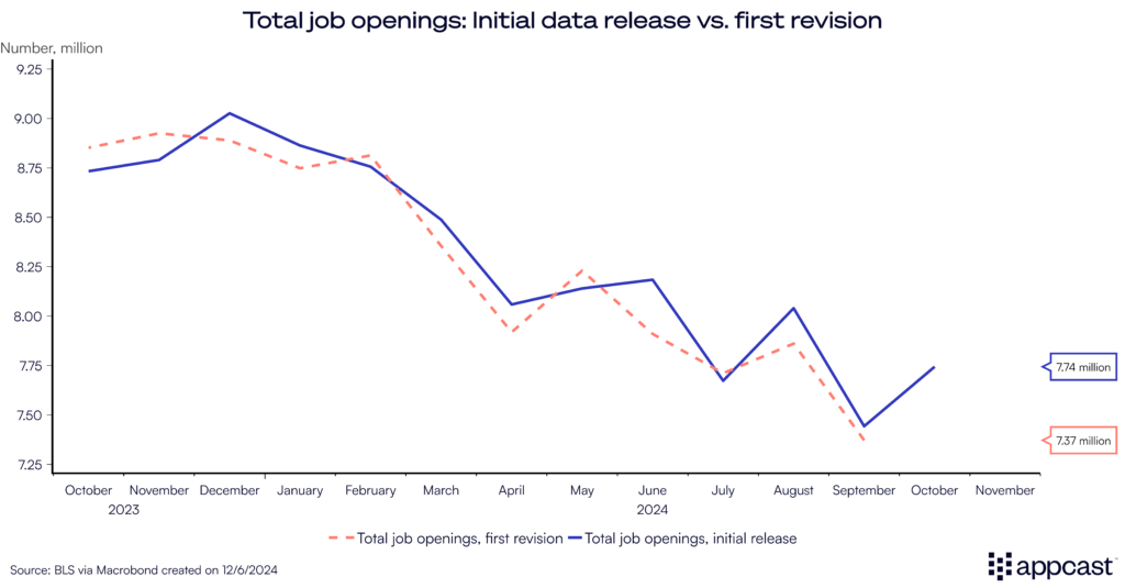 JOLTS publishes key information about the number of vacancies in the economy as well as hiring data and worker churn (quits, layoffs and discharges). While total job openings saw a significant increase from September to October, a word of caution is in order. The JOLTS data is somewhat volatile and has seen several spikes followed by subsequent declines over the last year. Furthermore, most data revisions since late 2023 have been negative, and the October data will probably not be an exception. Generally speaking, job openings seem to continue their long-run downward trend from their post-pandemic peak for now.