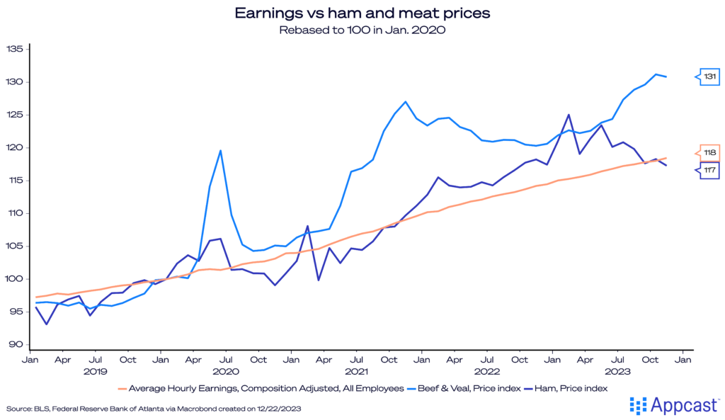 Whether you’re celebrating solo or hosting a party of dozens, odds are you’ll be buying a holiday meal (or already have!). When you do, you might notice that inflation has impacted your spending power for the main course. If you’re reading from the United States, prices for beef and veal products are up 31% from January 2020 after rising for much of this year. You’re in luck if your guests prefer ham: inflation has slowed throughout 2023 for ham products, now up just 17% from 2020. Wages are actually outpacing the price growth of ham now. We couldn’t find the inflation rate for “roast beast,” but it’s safe to assume that even the residents of Whoville are facing increased costs for holiday cheer.