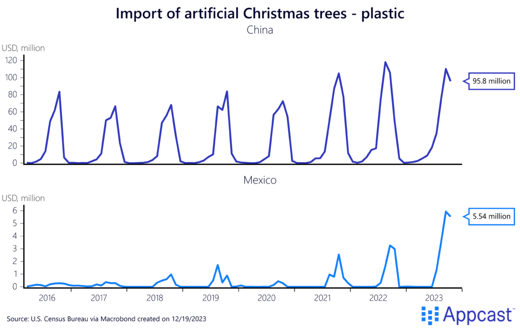 …Or next to the fireplace, or beside the couch, wherever you keep your tree! If you opt for a plastic tree, it may have had a different country of origin this year. The import of artificial Christmas trees from China peaked in 2022 and did not reach the same level in 2023. Simultaneously, imports of artificial trees from Mexico grew impressively in the past year. Of course, China’s exports are larger by magnitudes, but the growth from Mexico is an interesting thing to consider in a period when economic relations with China are being scrutinized more and more.
