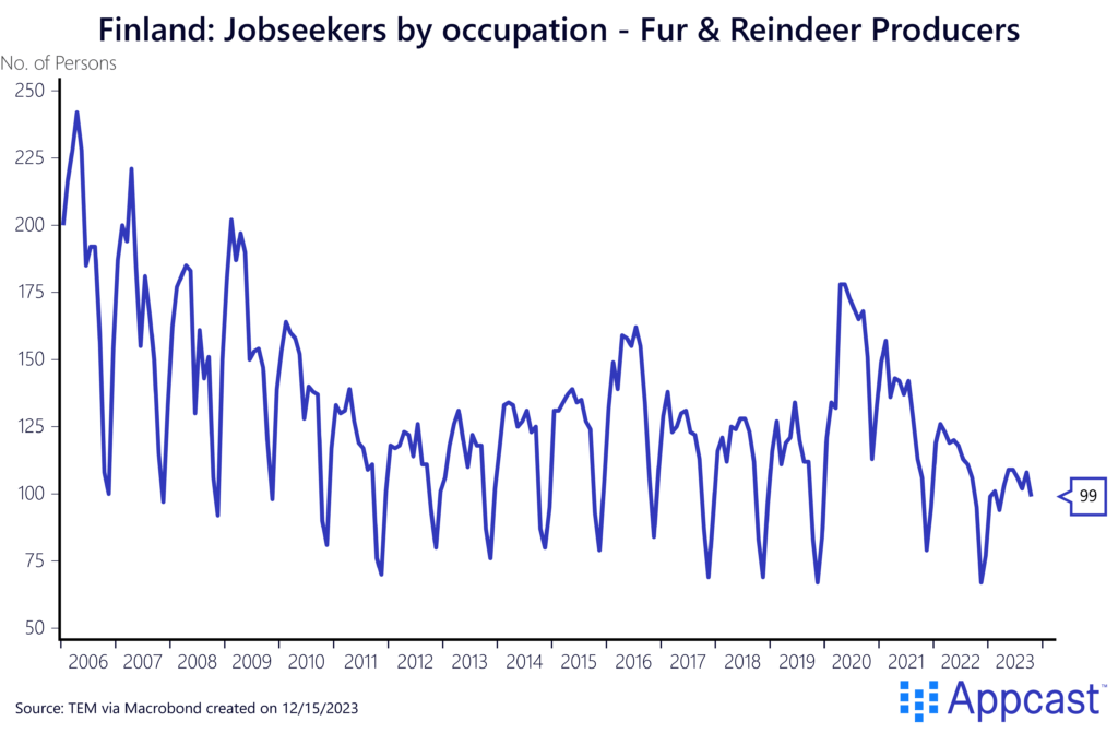 What’s Christmas without a little caroling? As you sing about Rudolph, you can totally lift the mood even further by telling everyone that those occupied in fur and reindeer production are quite happy with their employment situation! In 2023, there were fewer job seekers in Finland from the occupation, suggesting less turnover for the jolly profession.