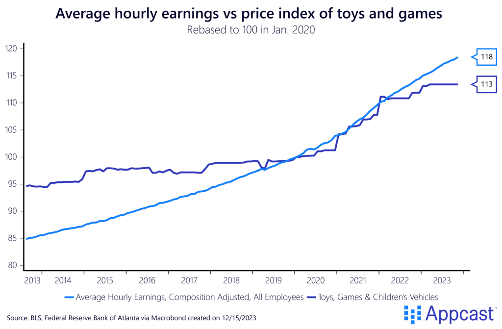 The meal isn’t the star of the show for children around the holidays. Instead, it’s the toys wrapped under the tree. For years, the price index of toys and games was relatively stagnant but jumped in 2020. In 2023, the price index for classic presents steadied again, now up 13% from January 2020. Wages have outpaced the growth; perhaps the presents under the tree will be less of a strain this year.