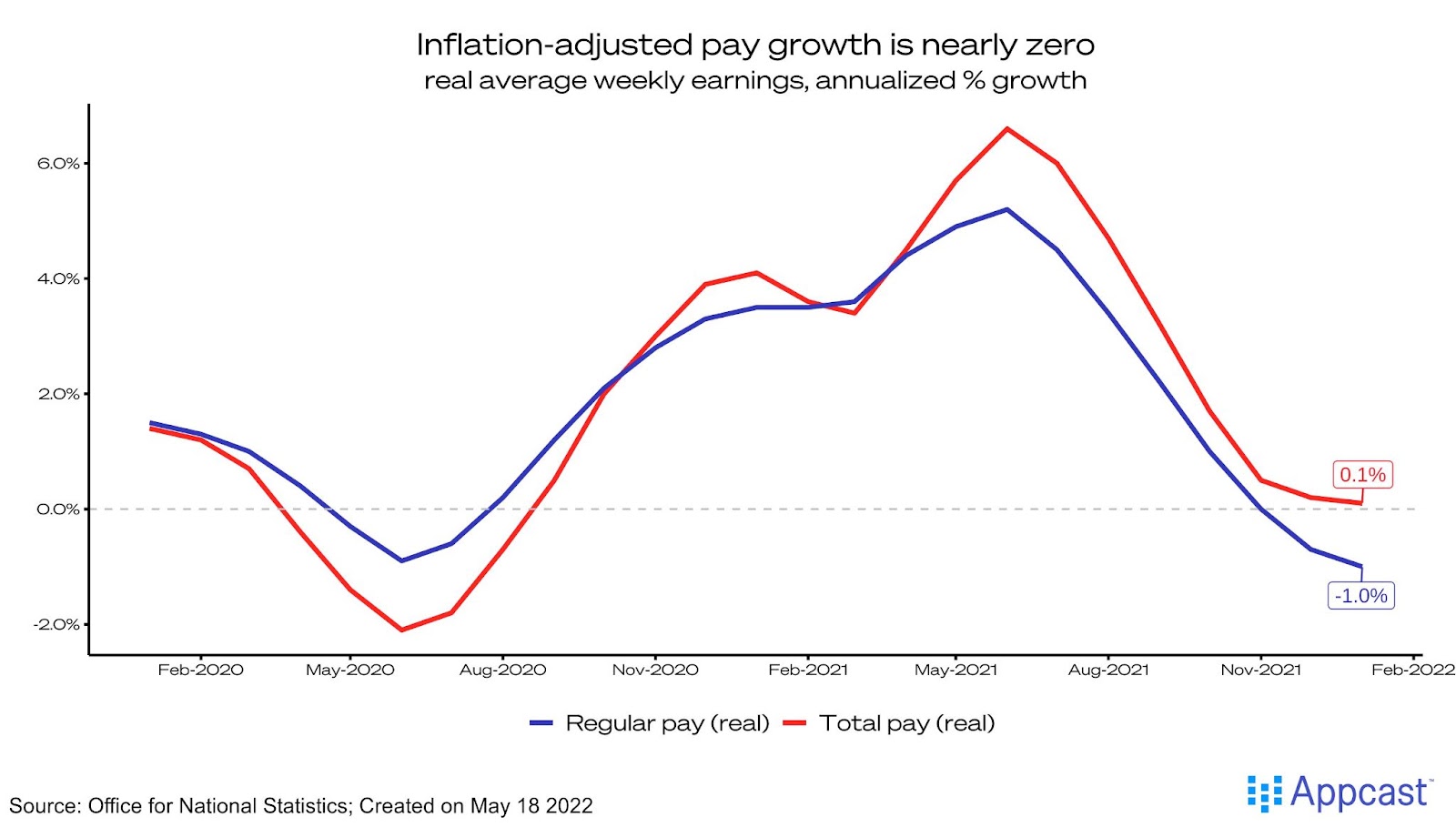 The cost of living crisis is real, as earnings adjusted for inflation have turned negative for most workers. And it’s not projected to get better anytime soon: The Bank of England warns inflation could top 10% later this year. High inflation is behind the BoE hikes in its main interest rate to 1%, but lackluster growth signals rising recession risks.