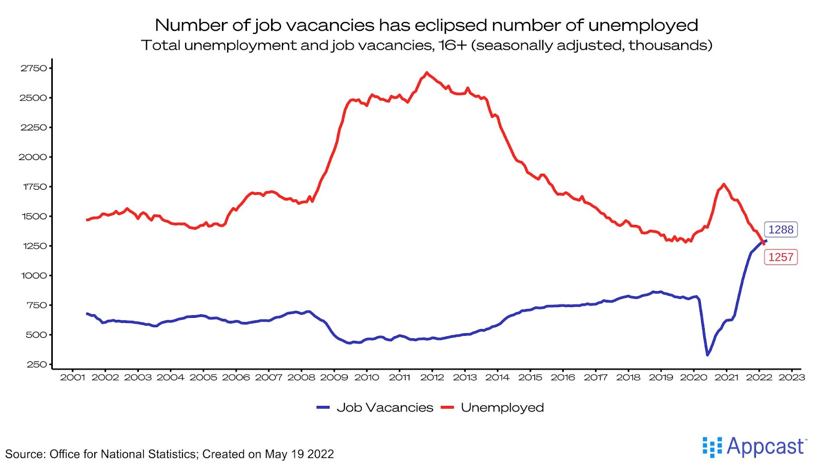 First, start with the paradoxical good news: job vacancies are booming and now exceed unemployed persons for the first time ever. Job vacancies hit a record high of 1.288 million, while the number of unemployed persons dipped down to 1.257 million. Demand for workers is about 60% above its pre-COVID level. The paradox is that while the U.K. labour market is extremely ‘tight’ – a good thing for workers – those same workers are suffering from a cost of living crisis.