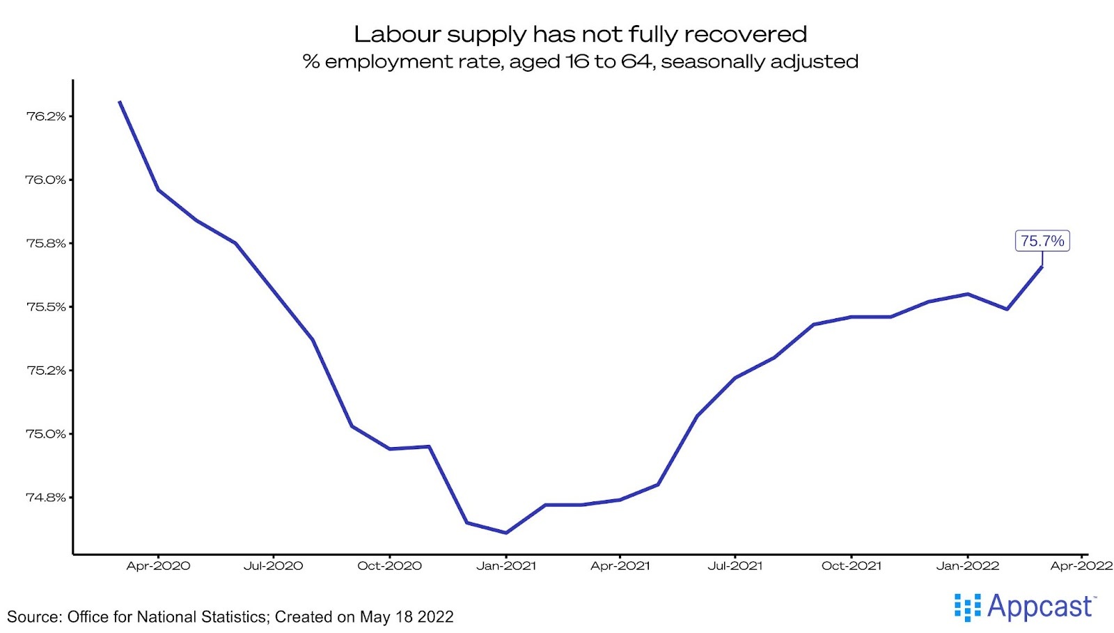 Yet job seekers haven’t returned to the labour force, despite COVID cases receding to a one-year low. A smaller share of workers are employed now than in the pre-COVID era: the employment rate of 16 to 64 year olds is at 75.7%, about a half percentage point below the early 2020 mark. This phenomenon – that anyone who wants a job can get one, but many without a job aren’t searching – has driven the unemployment rate down to 3.7%, the lowest in nearly 50 years.
