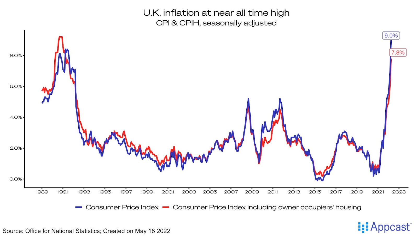 Meanwhile, job gains and GDP growth have been lackluster, and war in Eastern Europe has pushed the headline CPI inflation series to a 40-year high of 9% year-over-year. The more-reliable measure of inflation, CPIH (which includes owner occupied housing costs), is still very elevated, up 7.8% from a year prior.
