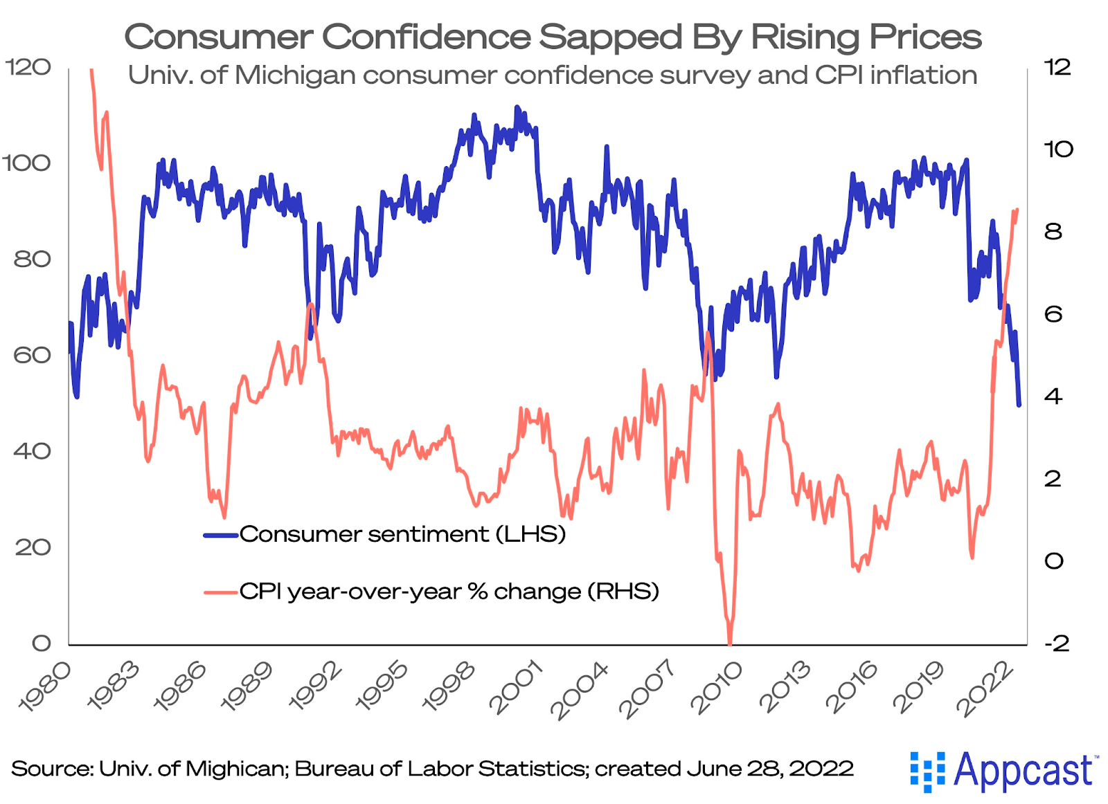 Inflation is on everyone’s mind, and the mood is souring. The University of Michigan’s Survey of Consumers for June was released last week and the numbers were dismal; consumers are not betting that inflation will turn the corner. Consumer confidence hit a record low in June, with consumers reporting high levels of uncertainty and blaming inflation for eroding their standards of living. Just yesterday, the Conference Board released their Consumer Confidence Index for June. They also reported declining consumer confidence, including the lowest measure of short-term economic expectations since March 2013.
