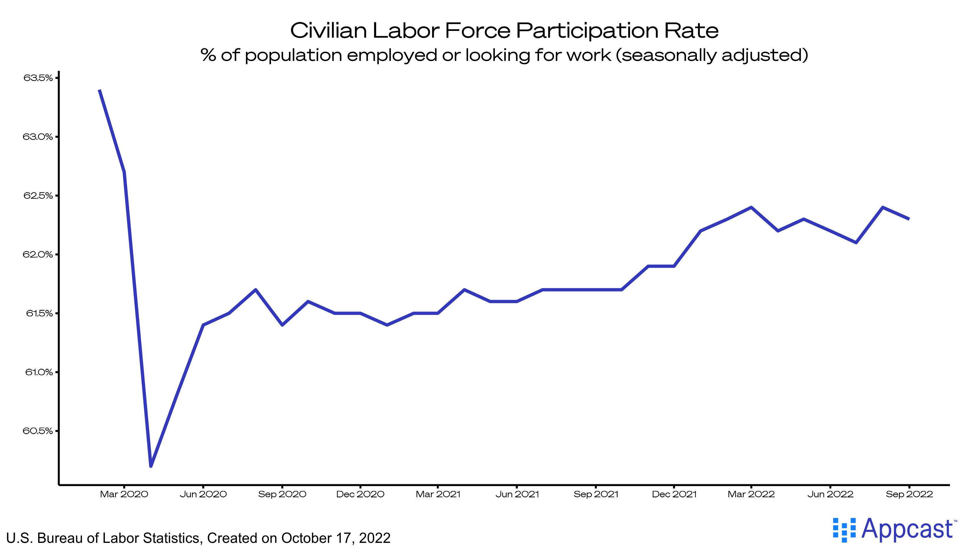 Overall, labor force participation rates are slightly behind February 2020 levels. In September, 62.3% of Americans were in the labor force compared to 63.4% pre-pandemic.