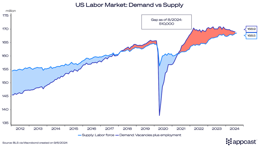 At a high level, the U.S. labor market is nearly at equilibrium – where supply matches demand. History may look back on August 2024 as the month this happened. Demand in the chart below is approximated by employment plus job openings. And it has been gradually declining for some time. Supply, which in this case means the labor force, has been on the rise – thanks to immigration, primarily. The two lines are about to intersect.