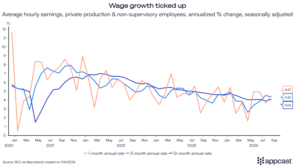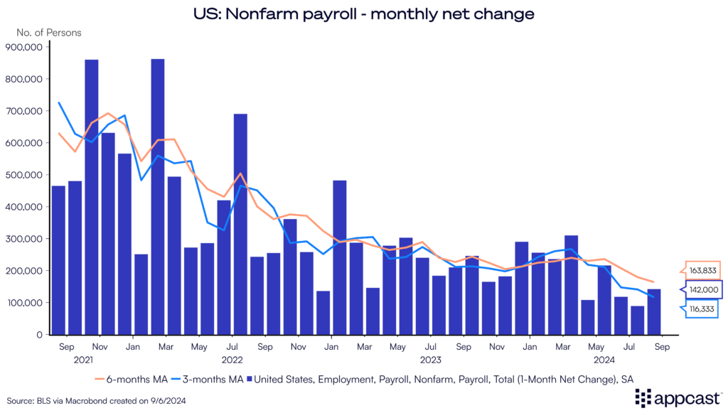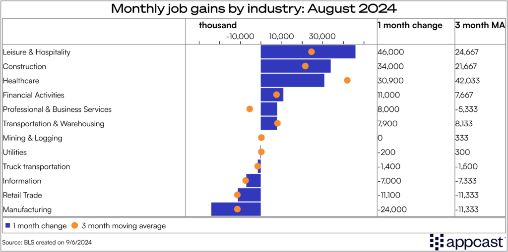 The more subdued gains were seen across private industries, even those previously unimpacted by interest rate increases. Healthcare, for example, added just 31,000 net new jobs in August, the lowest monthly gains in the sector since the beginning of 2022. Among industries, construction was a leader, adding 34,000 net new jobs last month – surprisingly strong considering the high interest rates. Manufacturing, however, which has held up in the past two years of elevated pressure, seems to be cracking, shedding 24,000 jobs in August. White collar jobs, or “standing up” industries, were nearly flat last month, with Professional and Business Services adding just 8,000 and information losing 7,000 jobs.