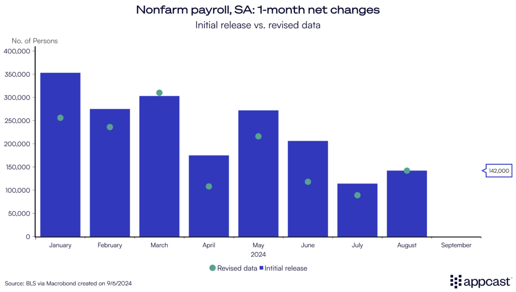 The downward revisions for June and July are noteworthy and follow primary benchmark revisions that showed over 800,000 fewer jobs were added in the 12 months from April 2023 to March 2024.