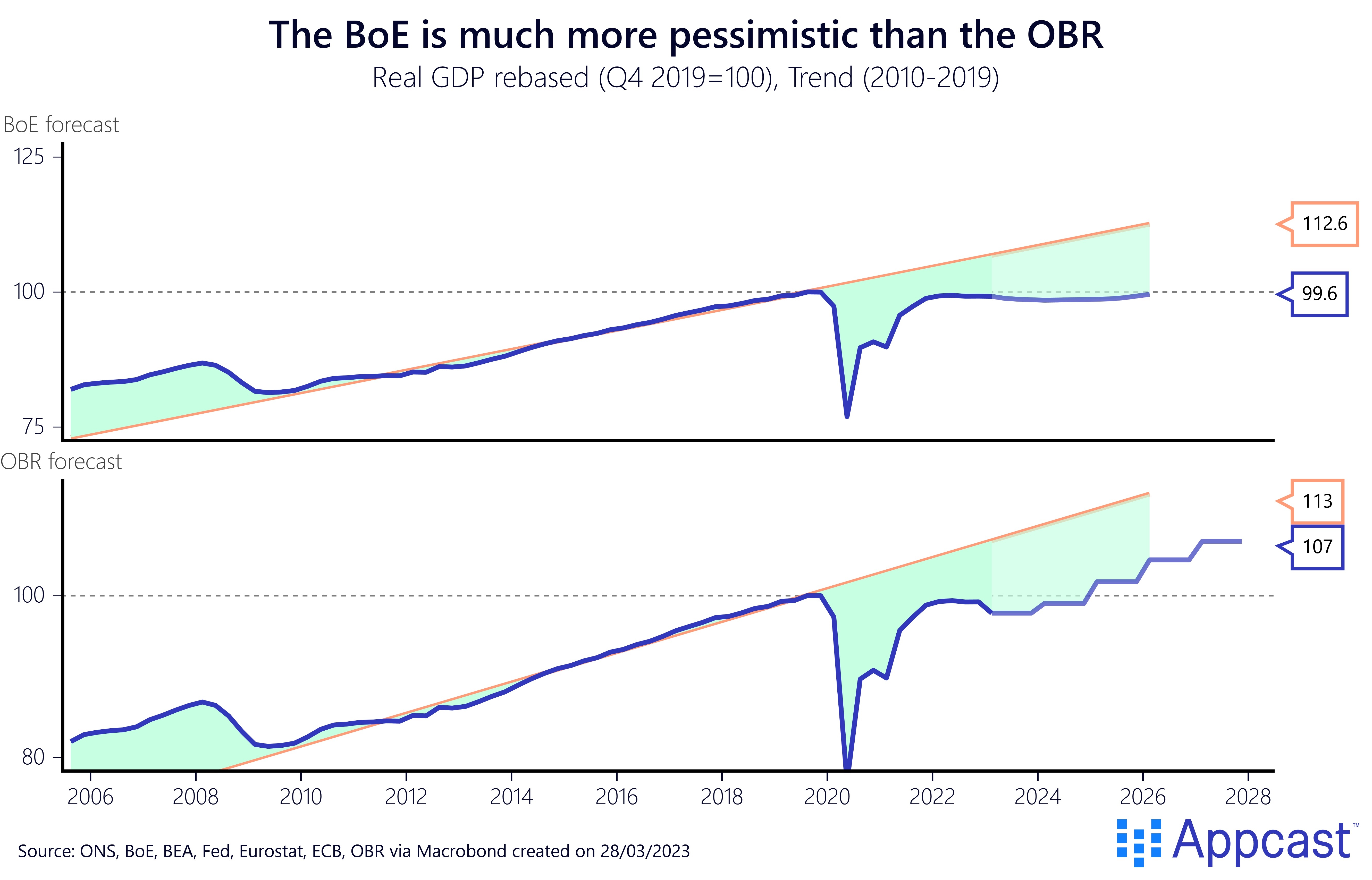 However, there is a massive disagreement between U.K. policy makers. On the one hand, you have the BoE in control of monetary policy. And on the other hand, you have the Office for Budget Responsibility (OBR), the independent economic forecasters of the UK Treasury, representing fiscal policy. The monetary and fiscal policy makers do not see eye-to-eye about the U.K. economy’s long-run economic growth potential, with the BoE being much more pessimistic. In fact, the gap between the BoE and OBR forecast amounts to a striking 110 billion pounds in 2025, or about 5% of GDP.