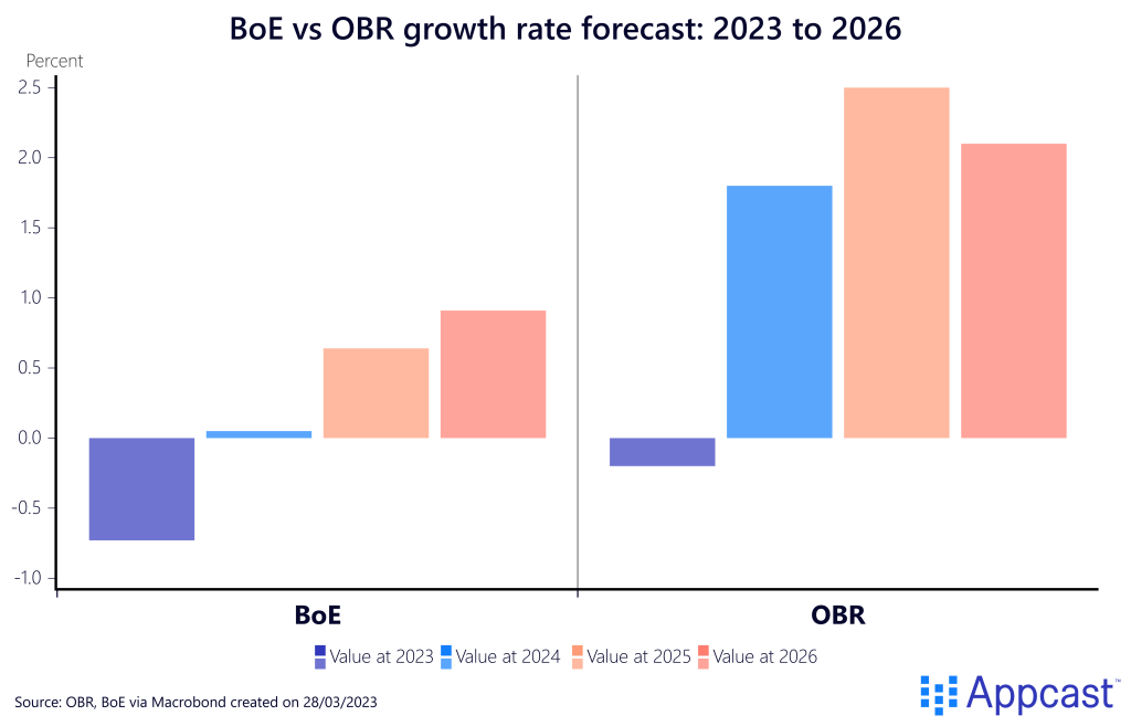 The OBR, on the other hand, is projecting both a shallower recession this year as well as a faster return to more normal growth, with the economy expending by more than 1.5% from 2024 to 2026.