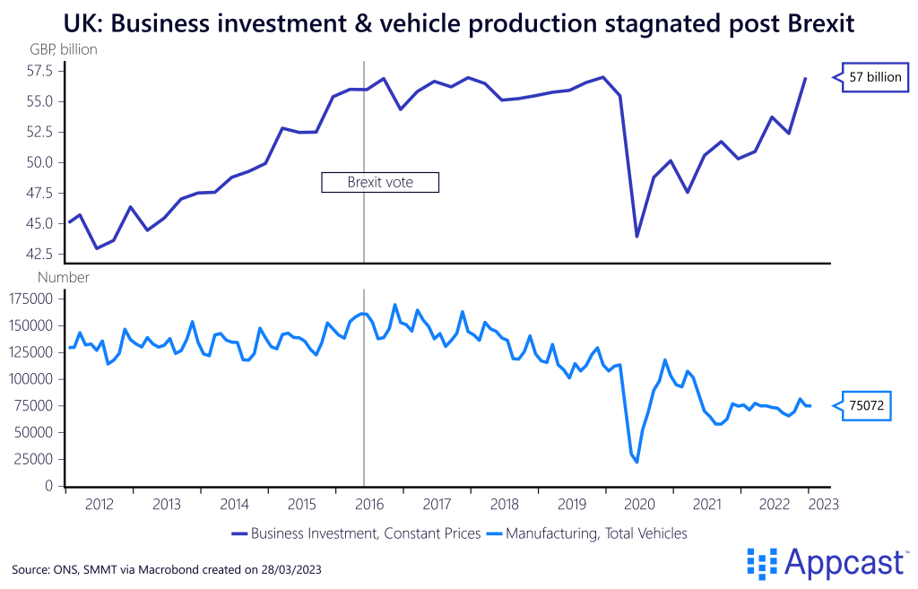 In general, U.K. business investment has been performing very poorly since the Brexit vote in 2016 with international companies reducing capital spending or leaving the country outright. Car production in the U.K., for example, has fallen off a cliff in recent years.