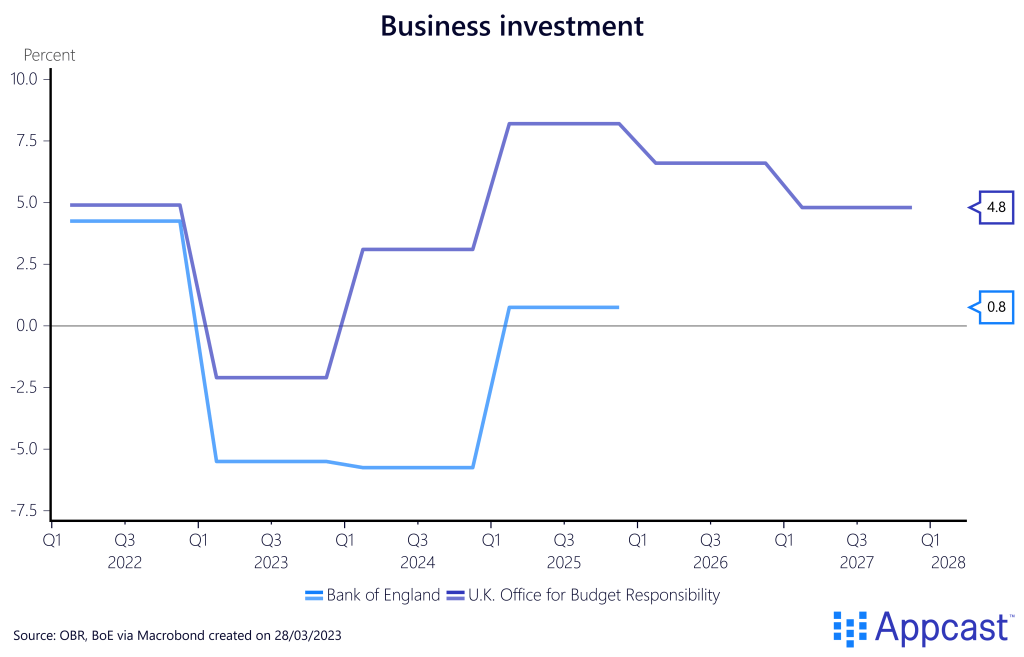 The BoE is assuming that adverse developments will drag on and that business investment is not picking up any time soon. They actually project a severe slump in business investment in 2023 with only a very modest recovery thereafter. The OBR, on the other hand, is more optimistic on that front, with a forecast of relatively high growth rates from next year onwards.