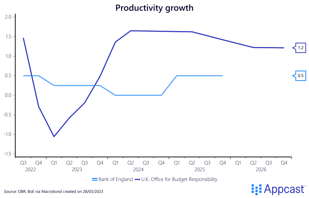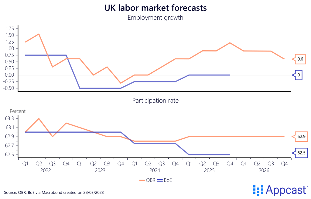 In general, the BoE is expecting higher unemployment rates and lower employment levels. Monetary policy makers assume negative employment growth throughout 2023 and 2024 with a declining participation rate. Meanwhile, the OBR assumes positive employment growth in the coming years with the participation rate remaining relatively unchanged.