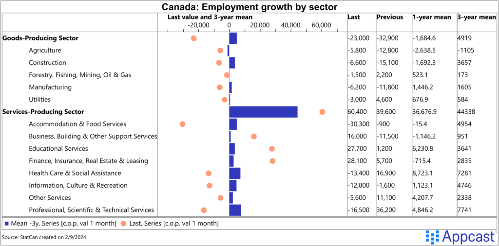 First, the majority of growth in the headline number was from an increase in part-time employment (+49k). Full-time employment fell by nearly 12,000 jobs (-11.6k), a concerning signal about the demand for hiring. This could potentially suggest a shift towards less-stable employment conditions, undoing several years’ worth of gains of full-time work.