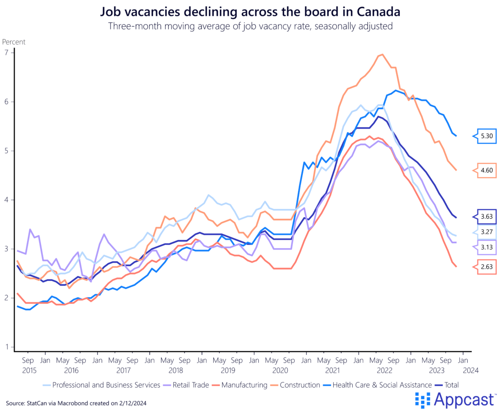 The overall demand for workers in Canada has notably decreased across all major sectors. For instance, in the construction industry, the job vacancy rate has sharply fallen from nearly 7% in 2022 to just 4.6% in the last winter.