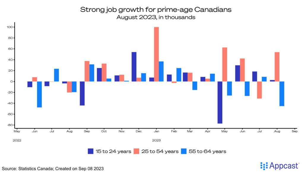 Digging into the details, much of the job growth went to the prime-age workforce (25-54 years) adding 53,900 new jobs, with a noticeable decrease of 45,200 jobs for the older workforce (55-64 years old).