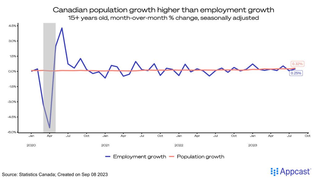 Liberal immigration policies have contributed to strong population growth in Canada. The stalling employment rate, now at 84.6%, shows that the labor market growth has not kept up with population inflows.