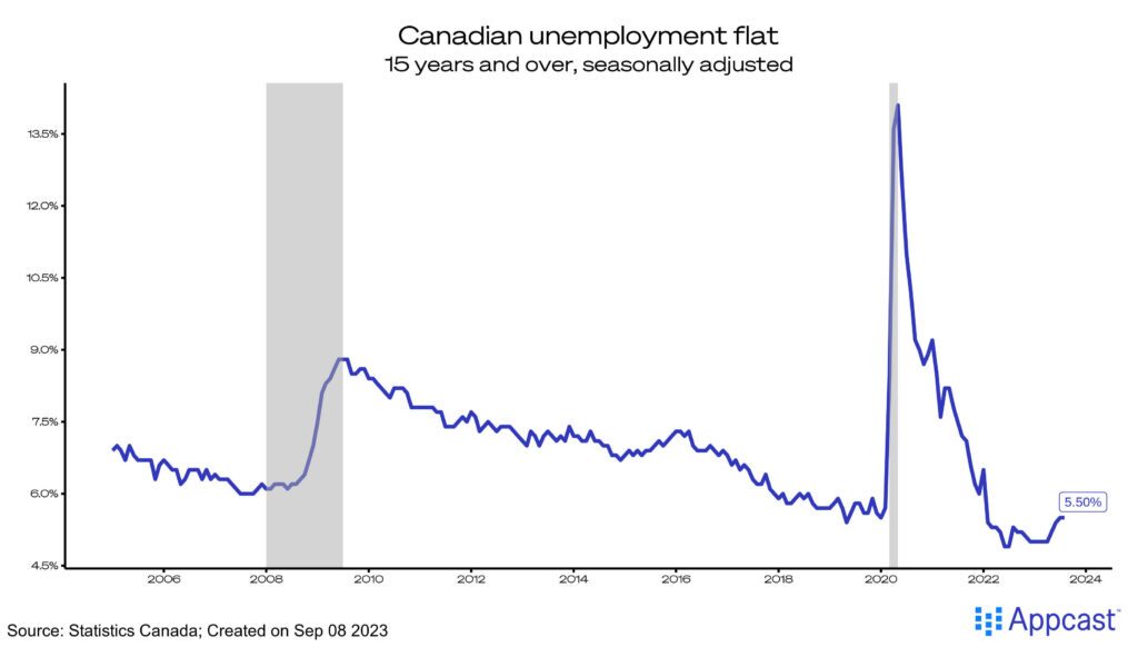 The Canadian economy added 40,000 net new jobs in August, a sharp contrast to the meager growth seen in July. The unemployment rate remained unchanged at 5.5%. The Canadian labor market is slowing and struggling to keep pace with population growth in the country.