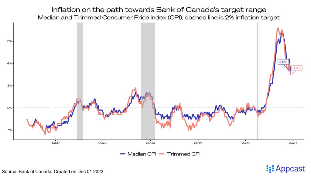 For inflation, the trend is heading in the right direction after the Consumer Price Index (CPI) fell for the second month in a row, down to 3.6% (median CPI). While the trend might be encouraging, it is still far above the Bank of Canada’s target goal of 2%. The process of reaching this goal will continue into 2024, where the decision to maintain or cut interest rates will be a delicate balancing act between a fragile labor market and too-high inflation.