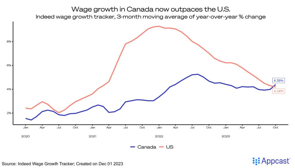 For the first time in over three years, wage growth in Canada is now outpacing the same metric in the U.S., according to Indeed’s data on advertised wages in job postings. Relatively stable over the past six months, wages ticked up to 4.4% (year-over-year) in November contrasted against the smooth decline in the U.S., down to 4.1%.