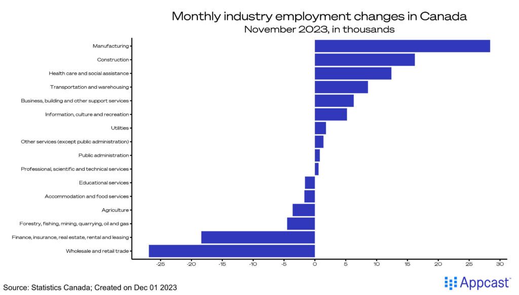 The labor market in Canada is in a delicate state. Job growth has been weak for several months now, not being able to keep up with the pace of population growth. Unemployment steadily creeps up from record lows. Wage growth is now higher than in the U.S., with still-elevated prices for consumer goods and services. The standout industries of construction and manufacturing do bring positive news for recruiters in those industries, but the situation for industries dependent on consumer spending is bleaker.