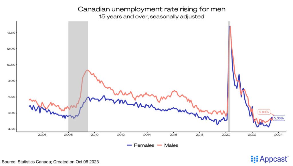 Canada’s labor market added 25,000 new jobs last month, while the unemployment rate increased for a second month in a row to 5.8%. This is now 0.8 percentage points above the historical low in April this year, indicating prospects for job seekers are getting more competitive. The total size of the population (age 15+) also grew by 78,000, more than triple employment growth.