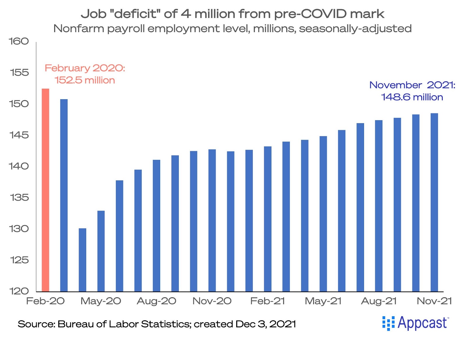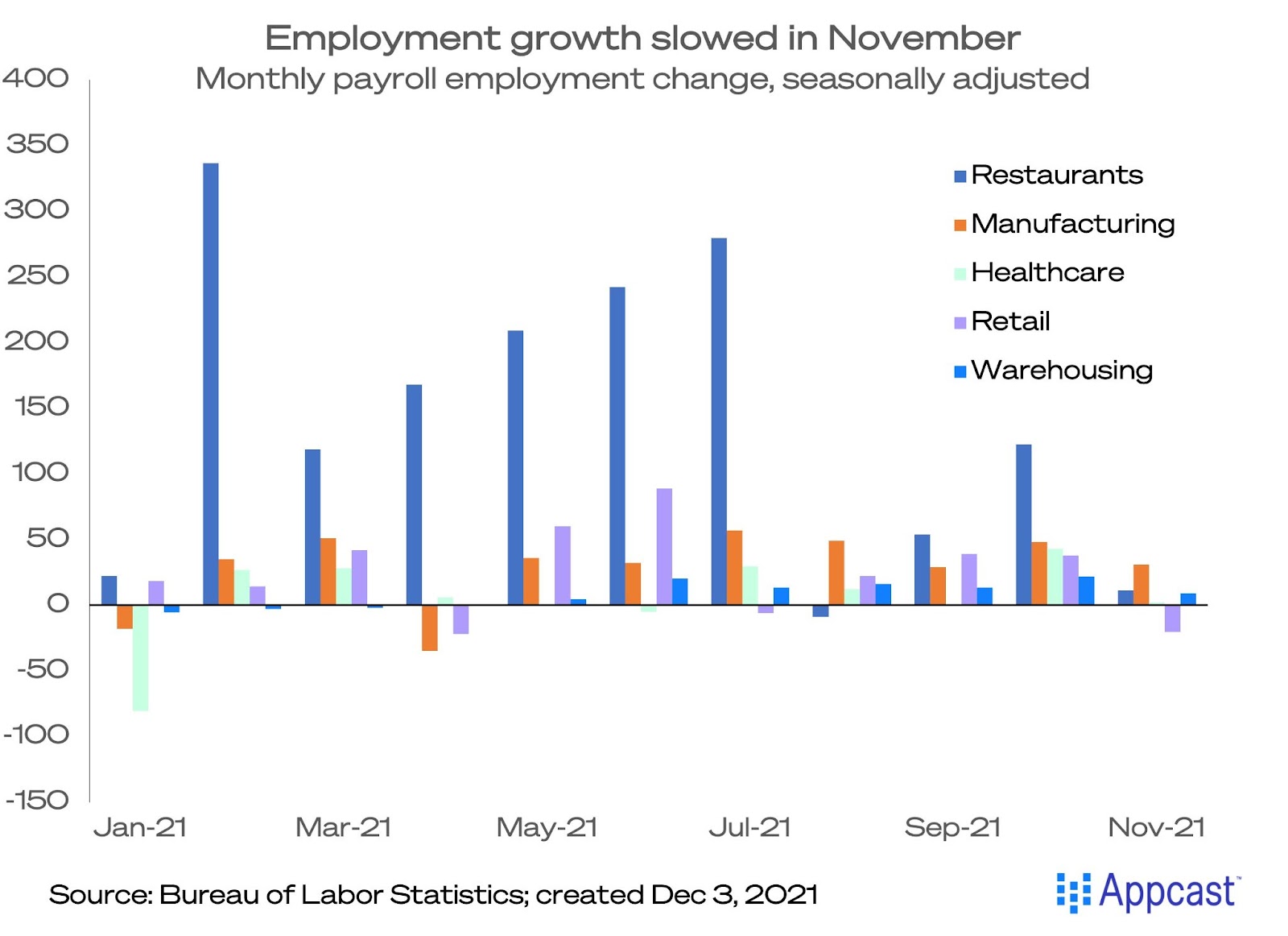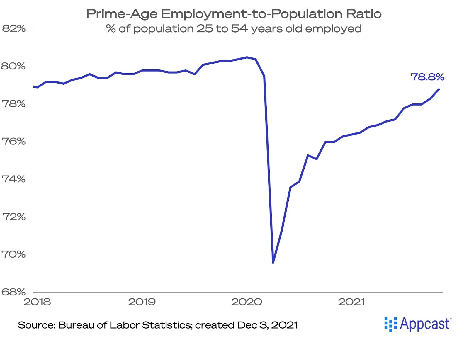 Weaker-than-expected job growth (according to the establishment survey) conflicts with strong increases in labor force participation (according to the household survey). If more would-be job seekers are lured into the labor force from rising wages, that could ease recruiting challenges. That said, with record-shattering levels of jobs available, this tight labor market is not going away anytime soon. Could the Omicron variant dampen hiring demand in December? Sure, we’ll have to see. But right now a disappointing and conflicting job report doesn’t change the basic story: competition for workers is intense.