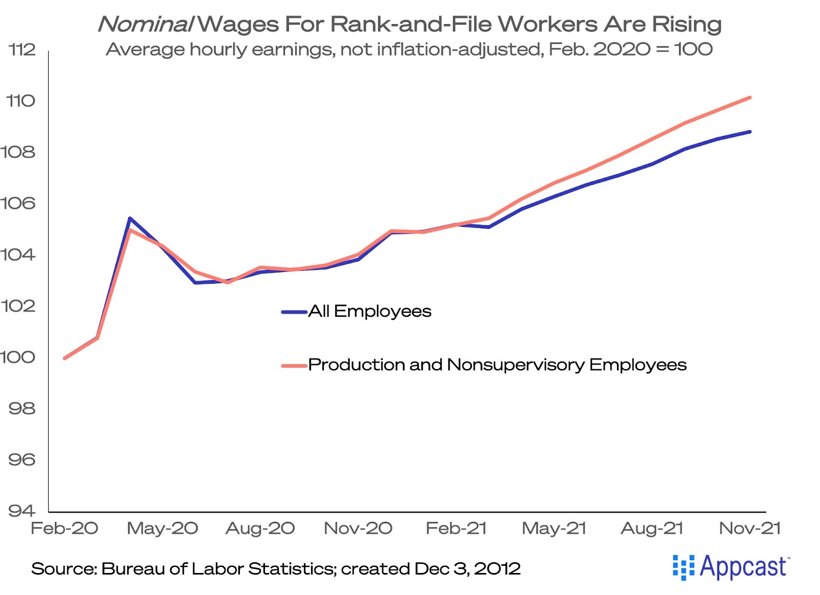 Wage increases for rank-and-file workers – production and nonsupervisory employees – accelerated in November, up 5.9% year-over-year. From February 2020, nominal wages are 10.2% higher for rank-and-file employees, and up 8.8% for all workers. Strong wage growth is from a confluence of factors – strong demand by employers and higher inflation being two notable causes.