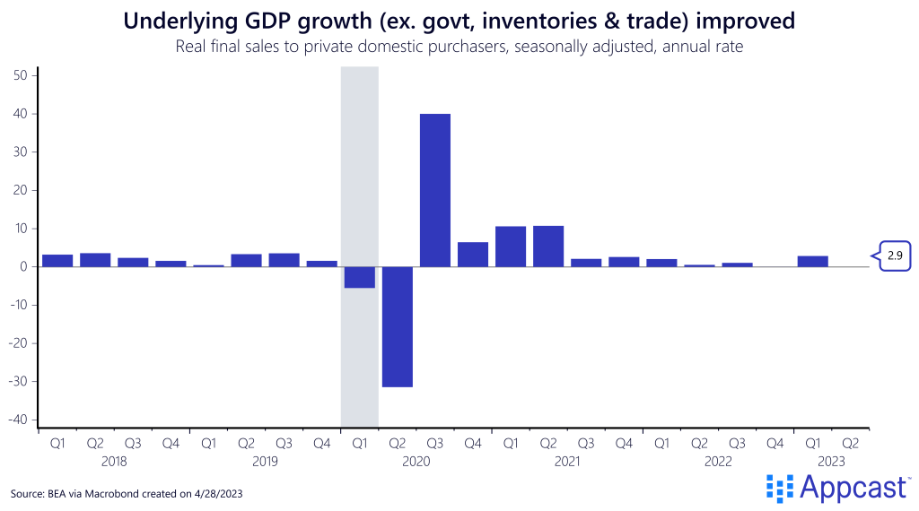 This slowdown from the prior quarter is better than it seems because of an inventory drawdown that shaved off around two percentage points of growth; and inventories (the stock of goods held by private businesses) have large swings quarter-to-quarter and don’t always represent underlying growth trends.