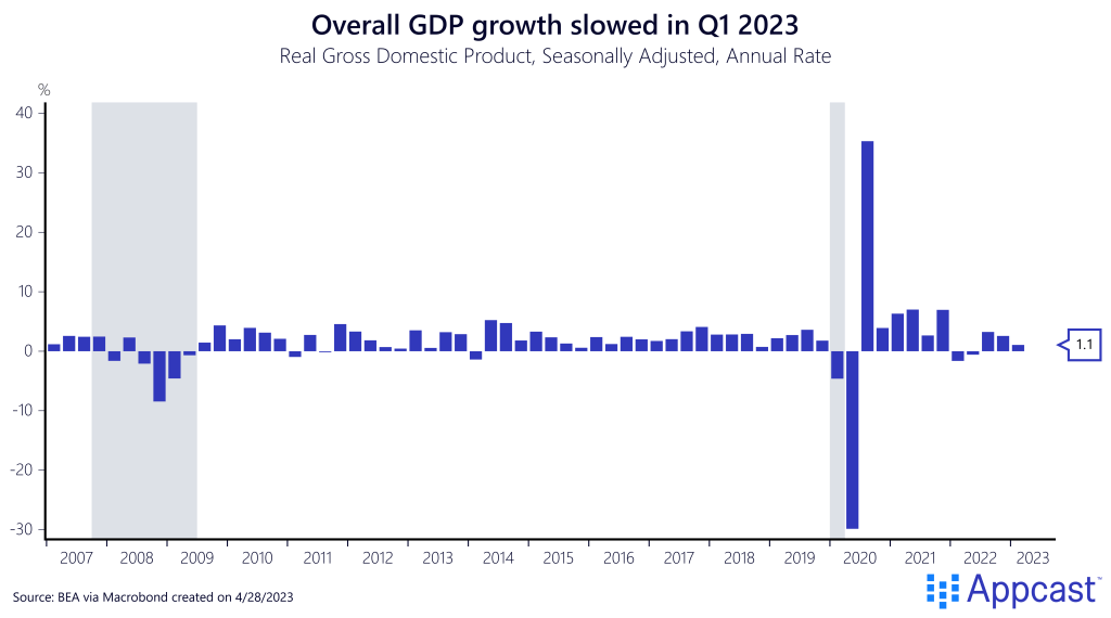On April 27, we got the first estimate of real Gross Domestic Product (GDP) growth in Q1 2023 – the inflation-adjusted amount of goods and services produced. The economy grew at a 1.1% annual rate, down from 2.6% in Q4 2022.