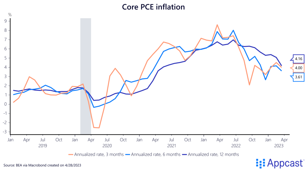 And inflation remains far above the 2% target, no matter how you slice it. The personal consumption expenditure index (PCE), the Fed’s preferred gauge of inflation, was up 5.0% from the year before in March. Core PCE inflation, stripped of volatile food and energy prices, was up 4.6% year over year. Core PCE is trending down, with a twelve-month annualized rate of 4.16% in March. The six- and three-month annualized rates have rebounded in the first quarter – inflation is slowing but not as quickly as the Fed would like to see.